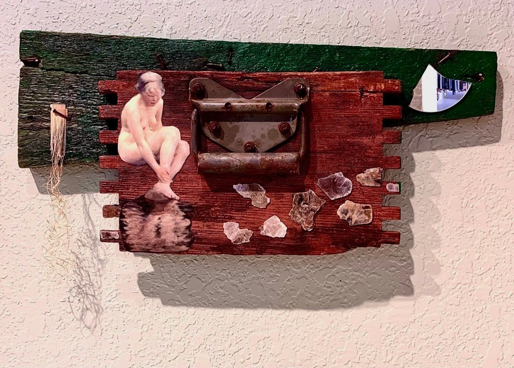 2024-- mica, broken mirror, wood, cut-out, front of an old draw, torn window shade.